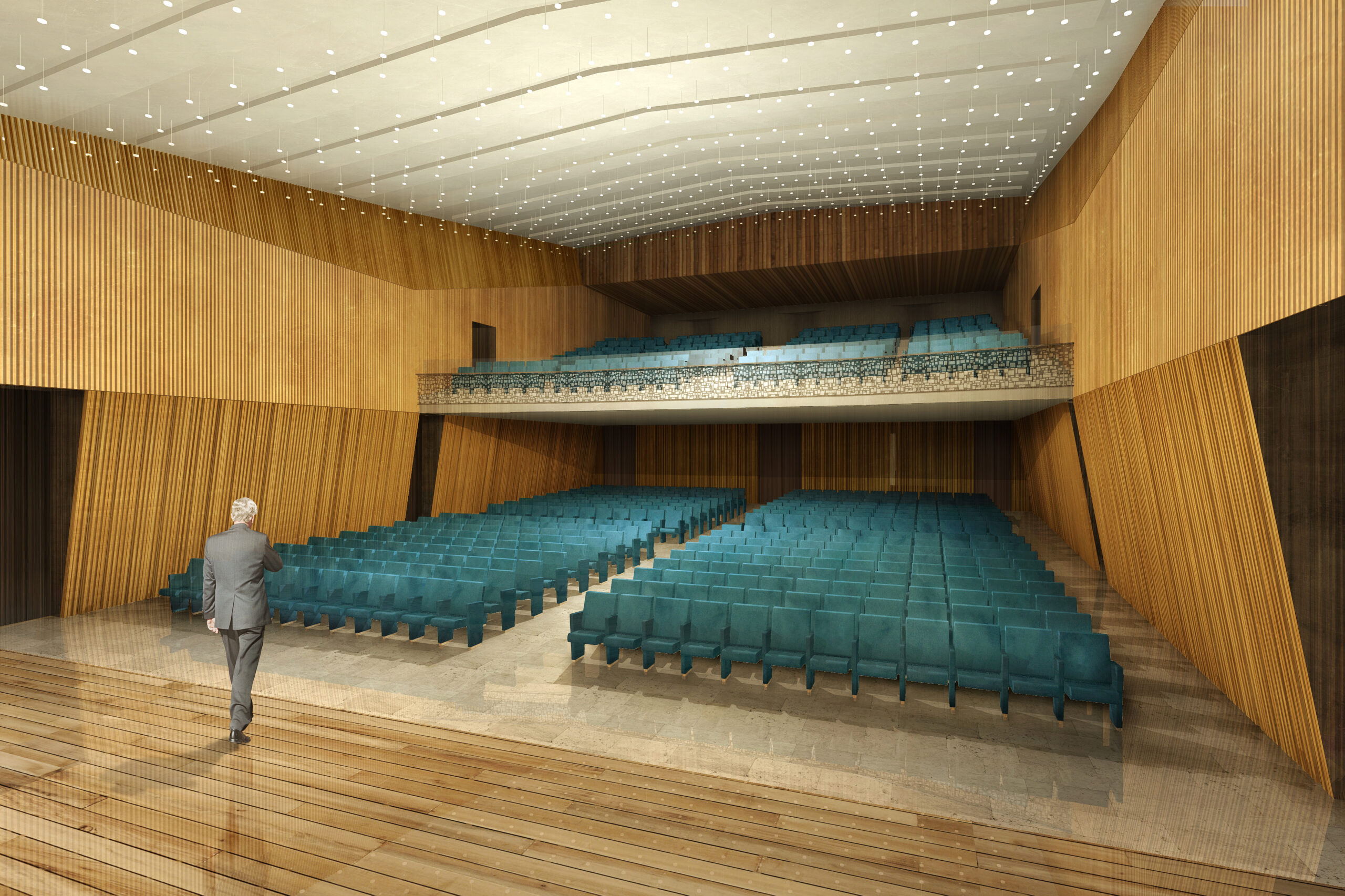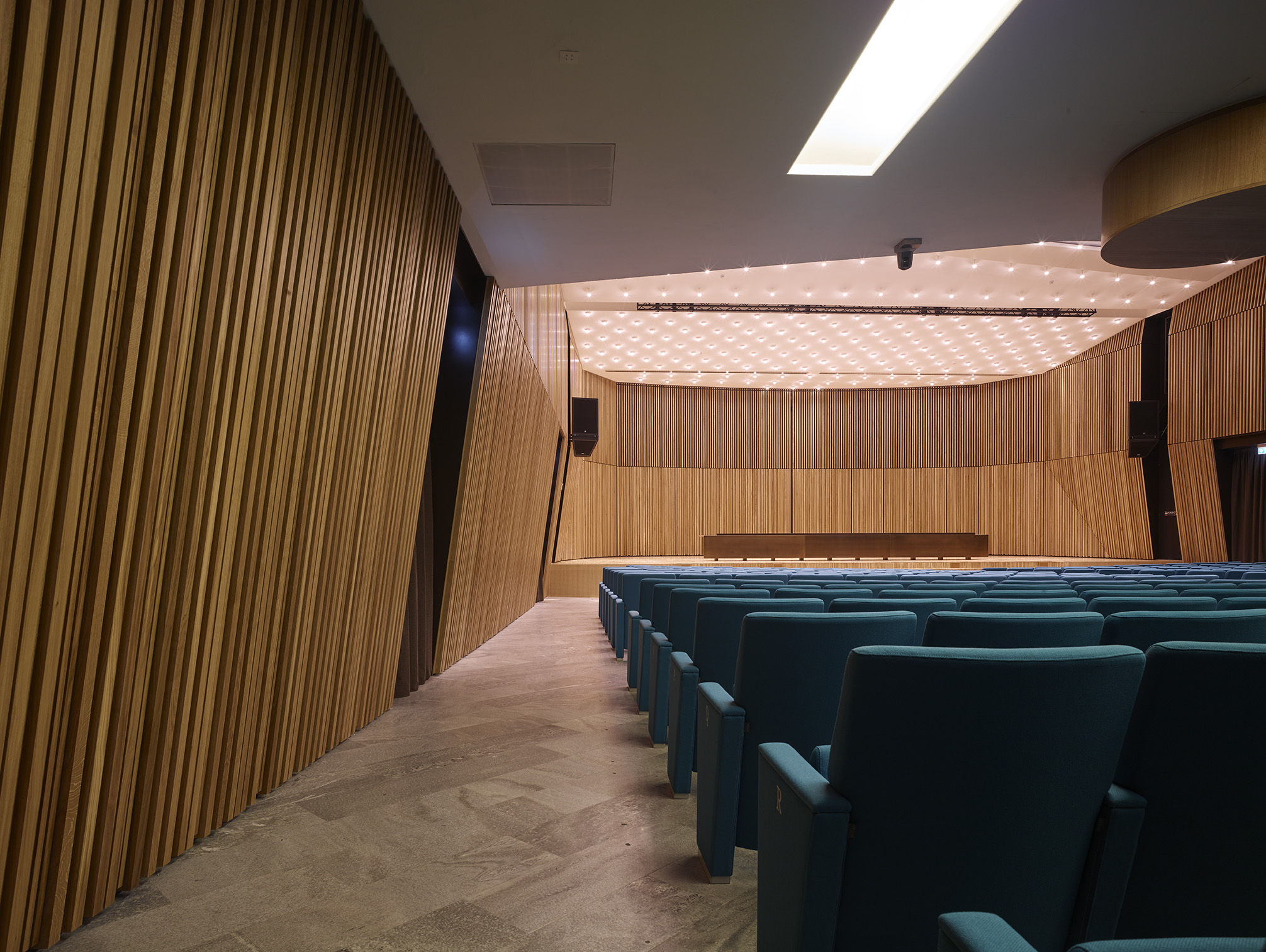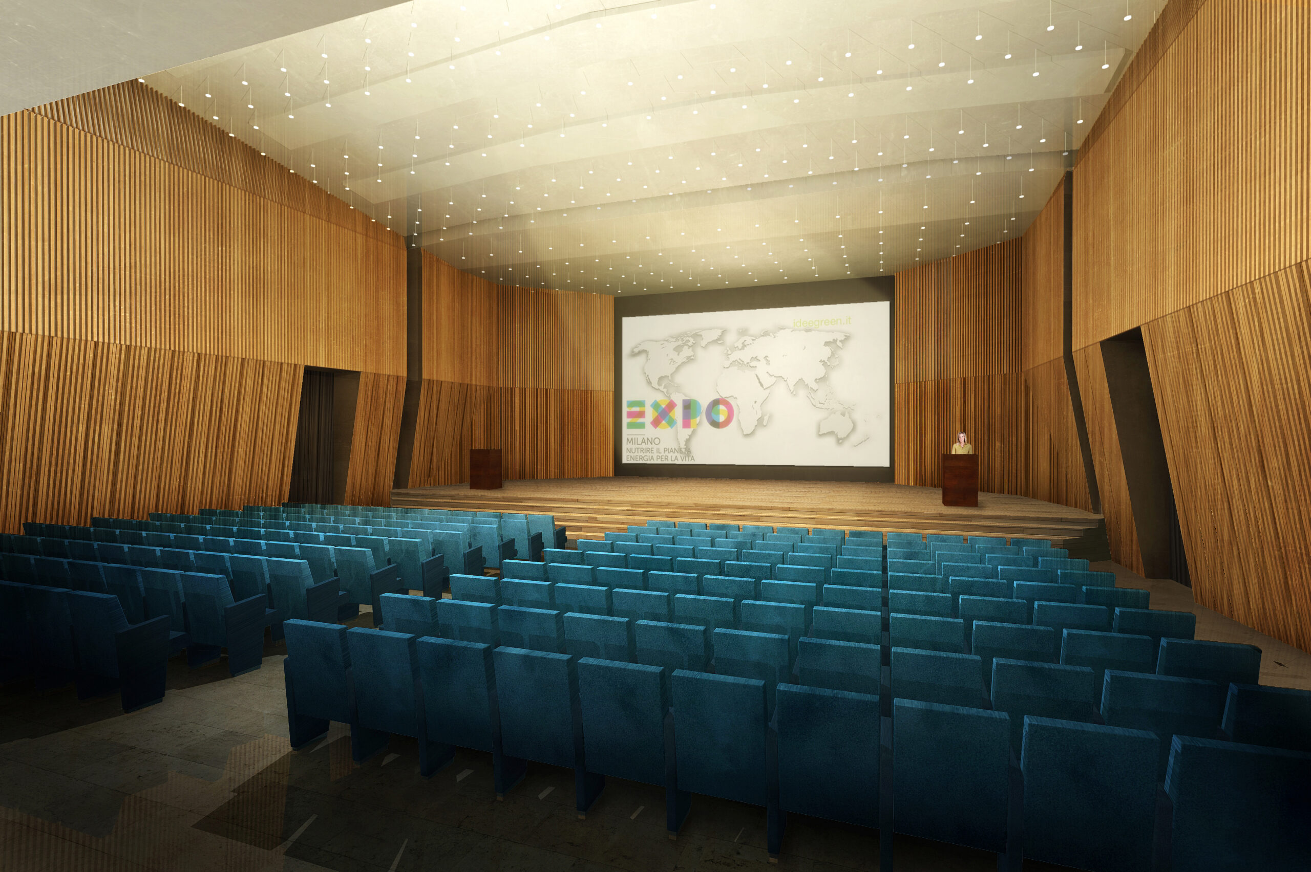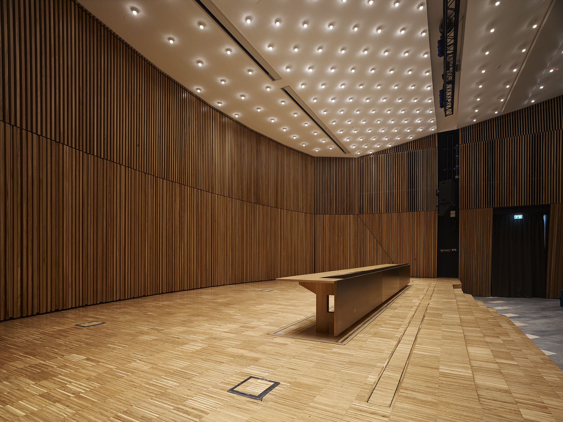 Tre le idee per risolvere il progetto: una bella parete, un bel soffitto, un bel palco. La parete di legno, con la sua geometria e il suo disegno, avvolge il visitatore e convince i tecnici degli impianti. Il soffitto, con le sue luci, illumina la sala e amplifica lo spazio esistente attraverso la sua morbidezza e leggerezza. Il palco, con i suoi oggetti monolitici, si presta ad essere utilizzato dall’oratore, come dall’artista, il ballerino, l’attore o chiunque esso sia.