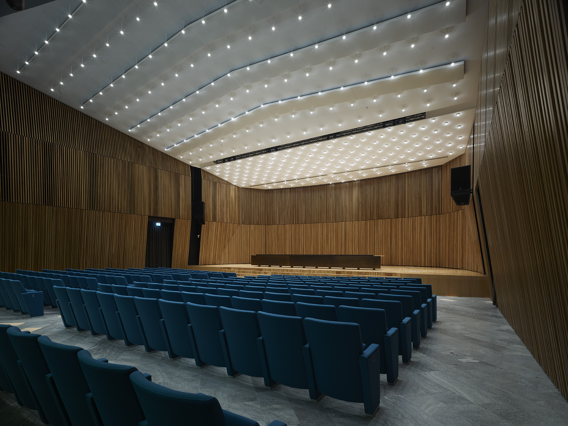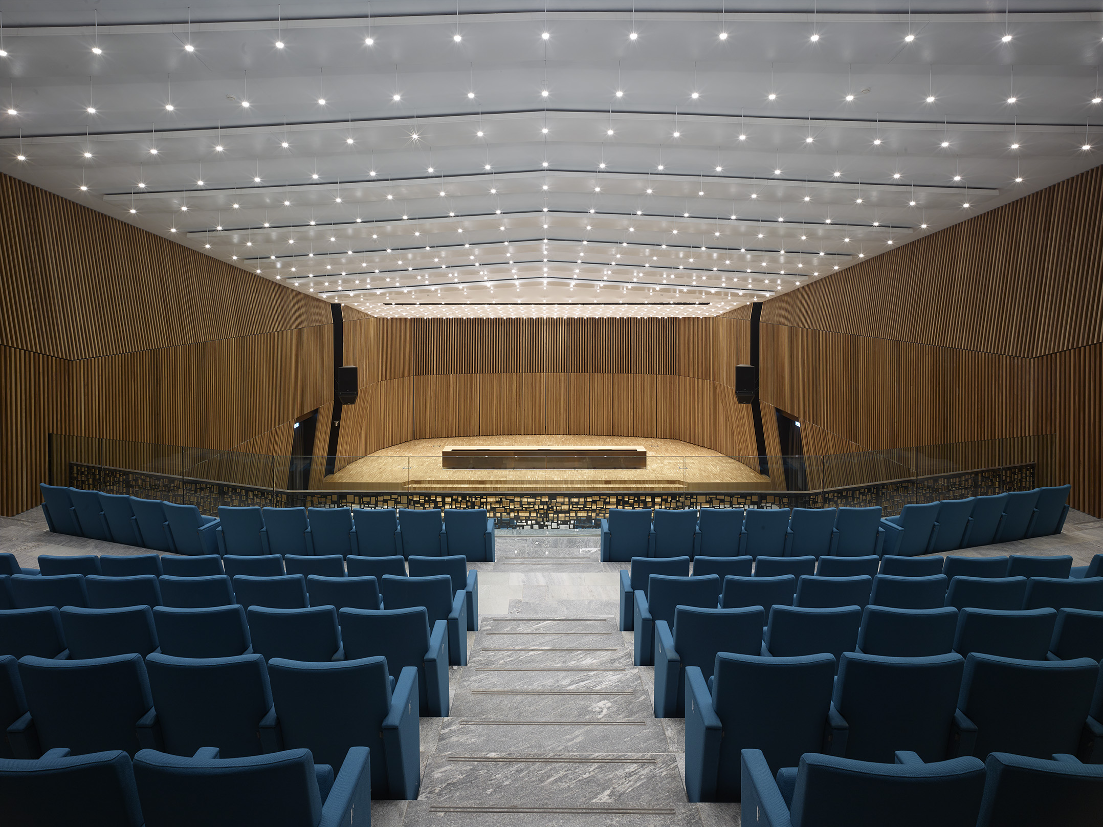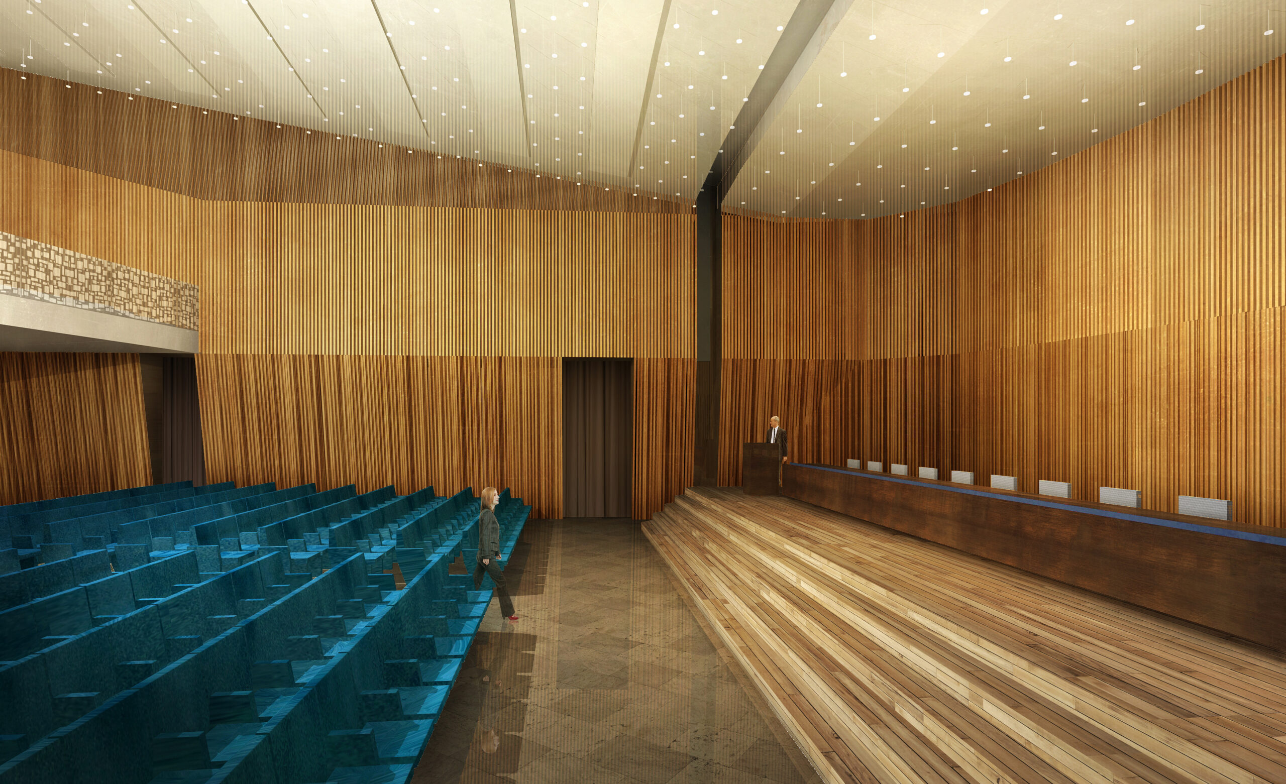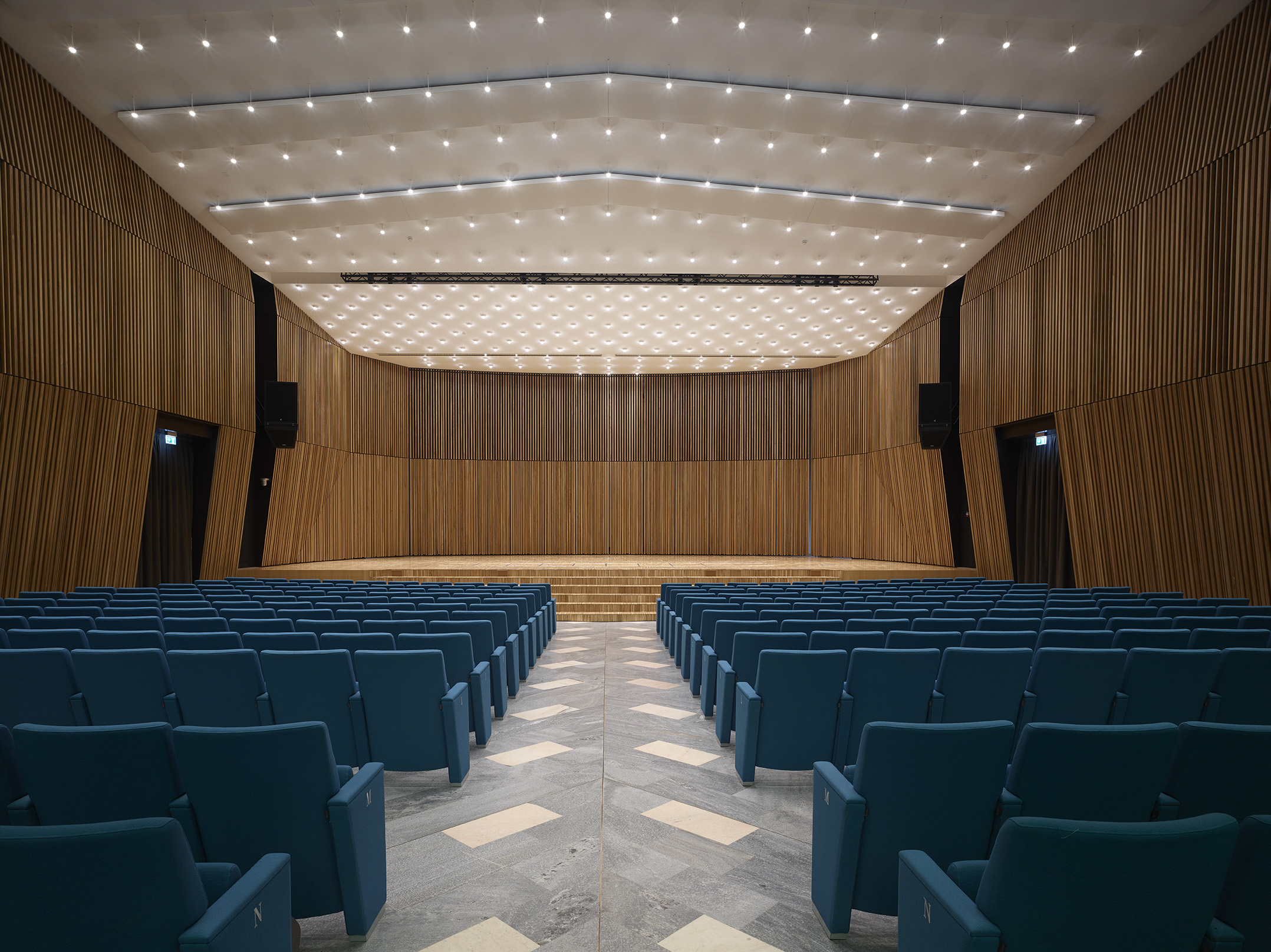 Tre le idee per risolvere il progetto: una bella parete, un bel soffitto, un bel palco. La parete di legno, con la sua geometria e il suo disegno, avvolge il visitatore e convince i tecnici degli impianti. Il soffitto, con le sue luci, illumina la sala e amplifica lo spazio esistente attraverso la sua morbidezza e leggerezza. Il palco, con i suoi oggetti monolitici, si presta ad essere utilizzato dall’oratore, come dall’artista, il ballerino, l’attore o chiunque esso sia.