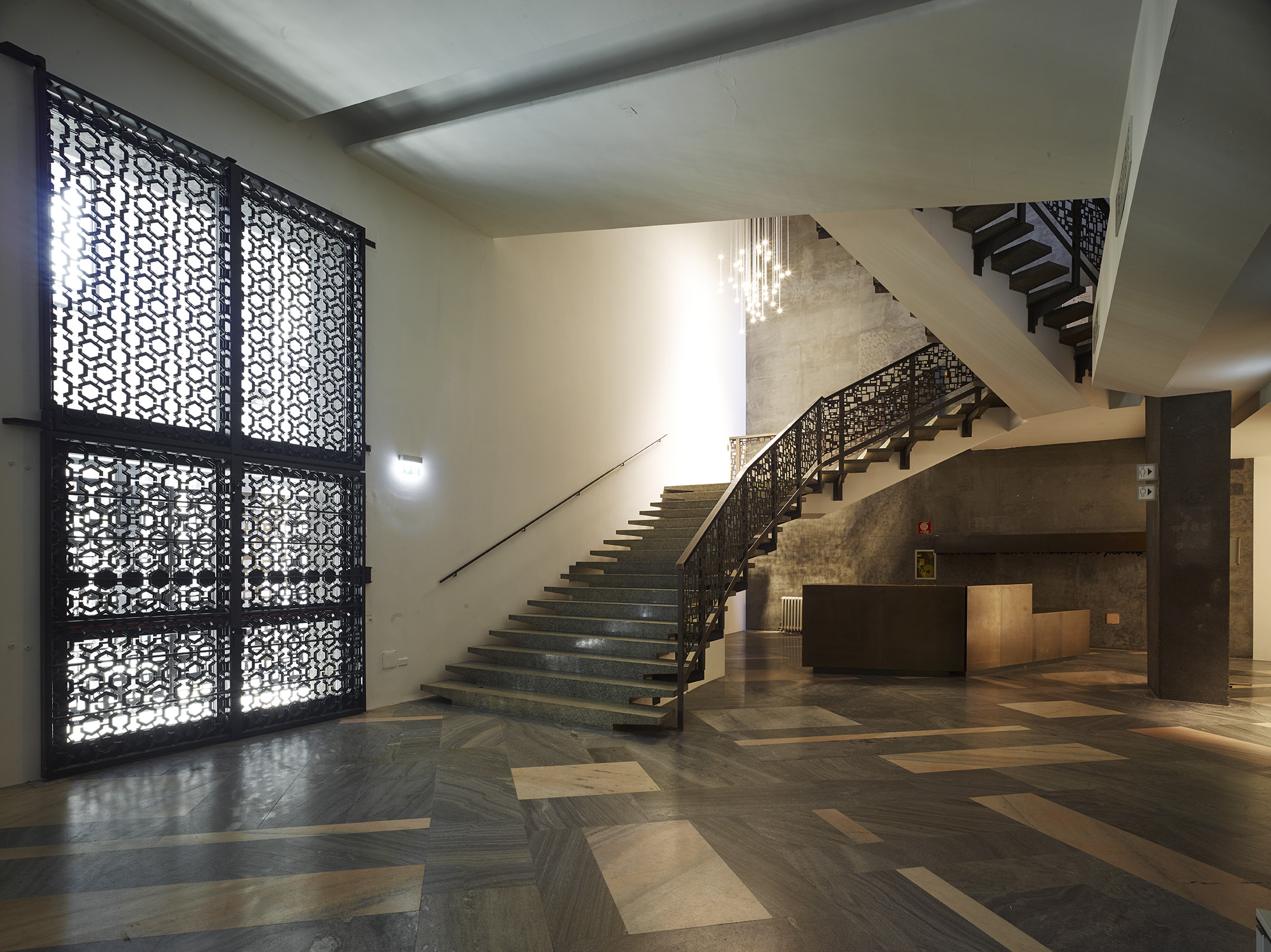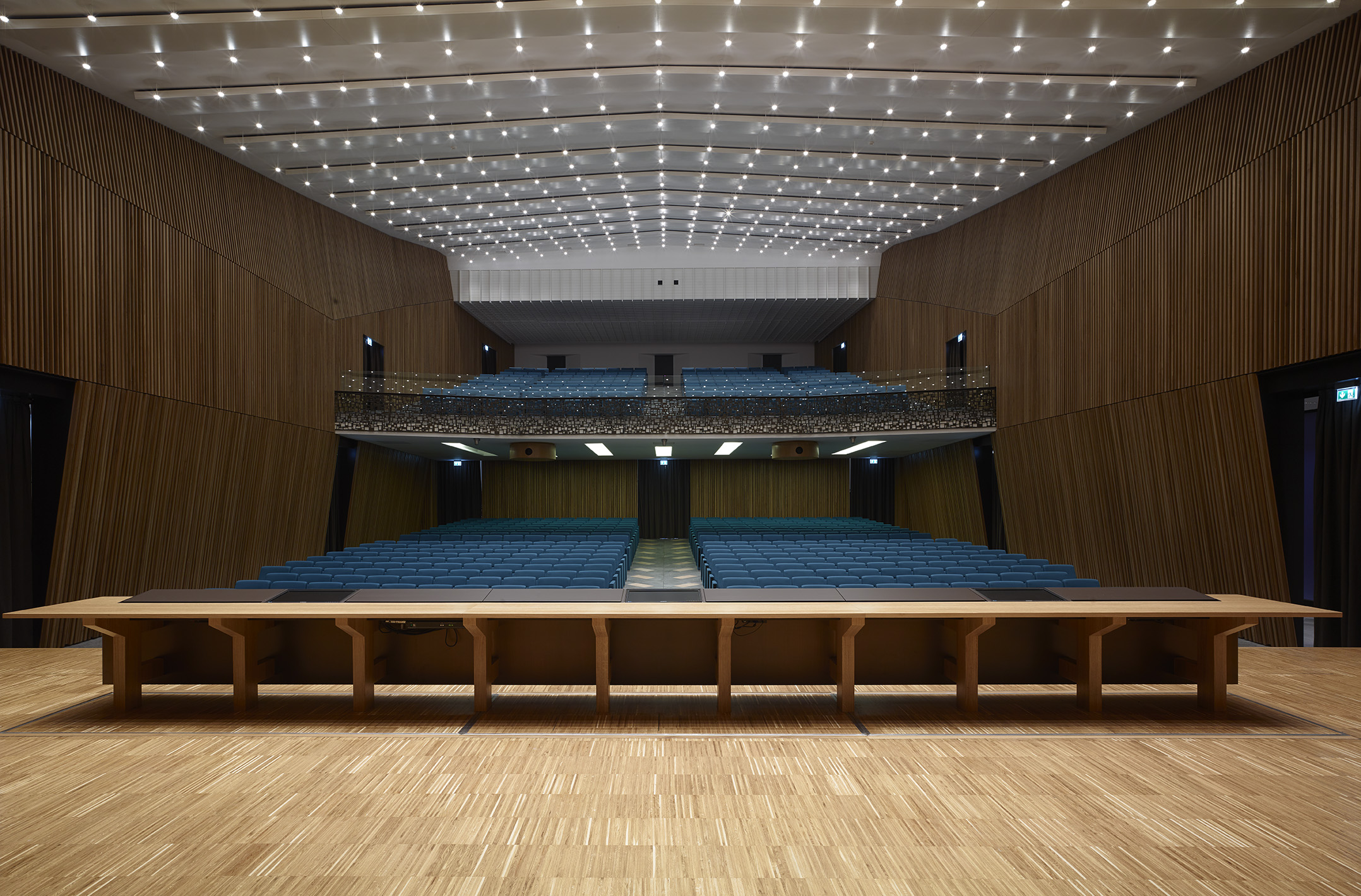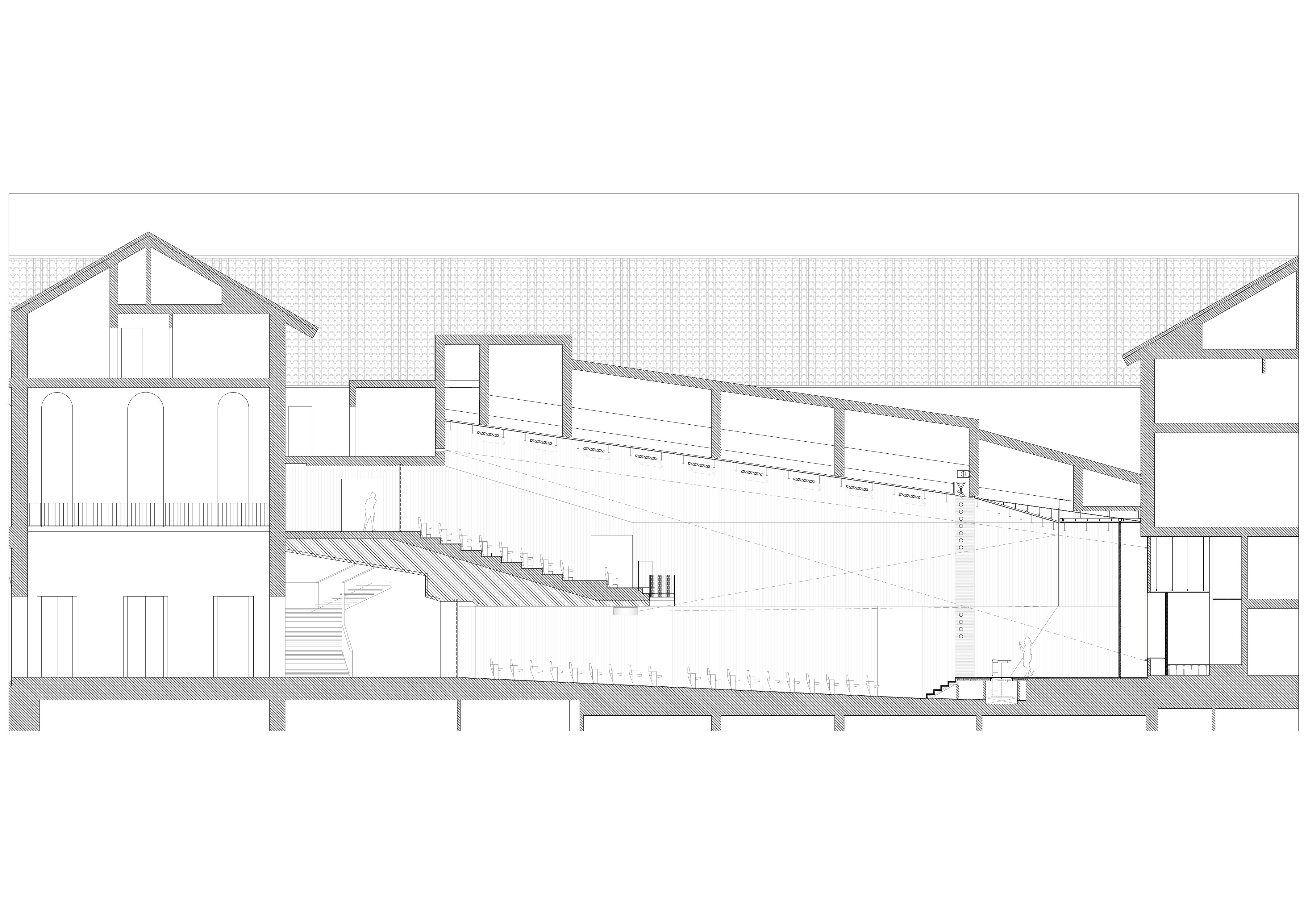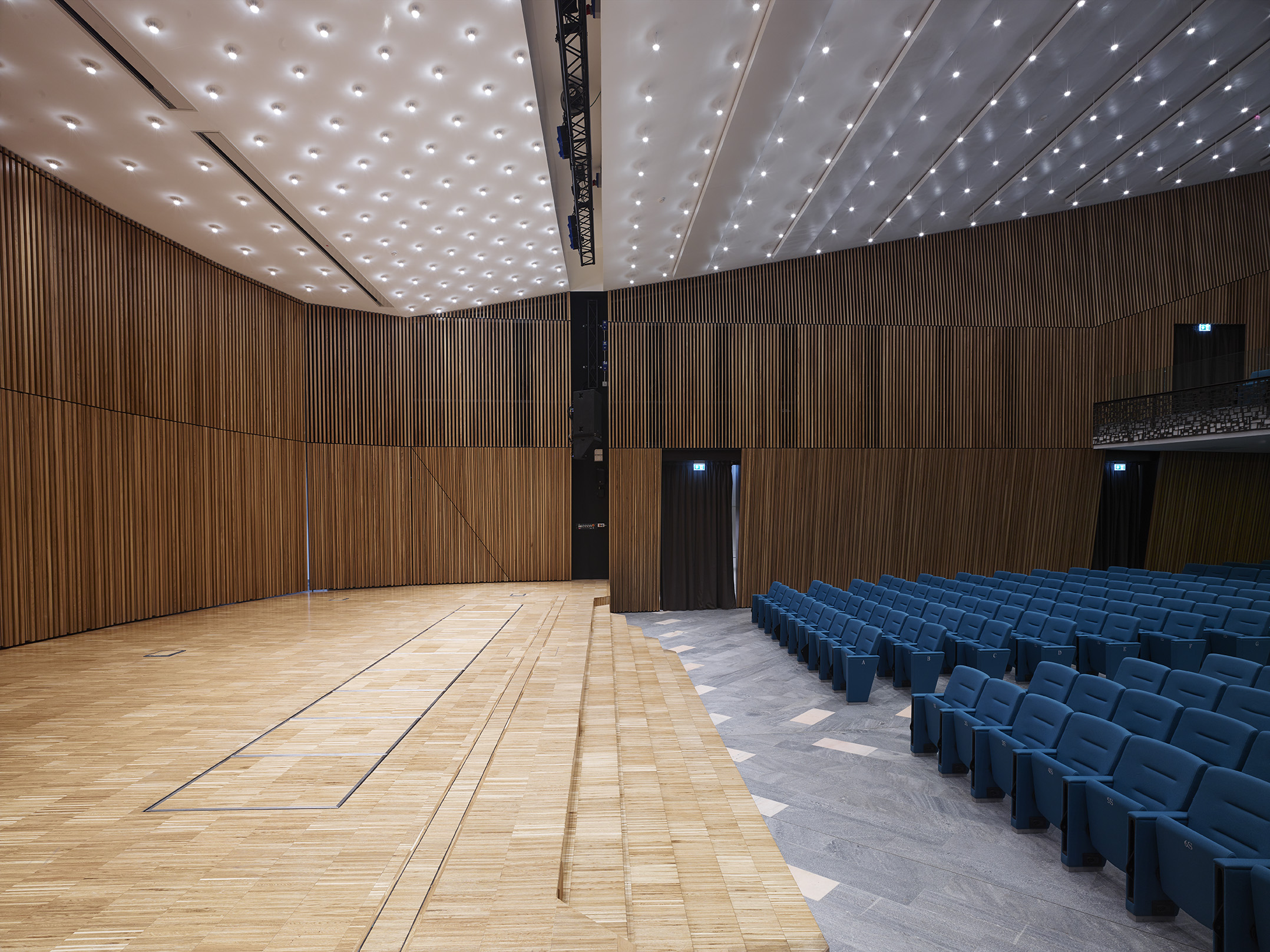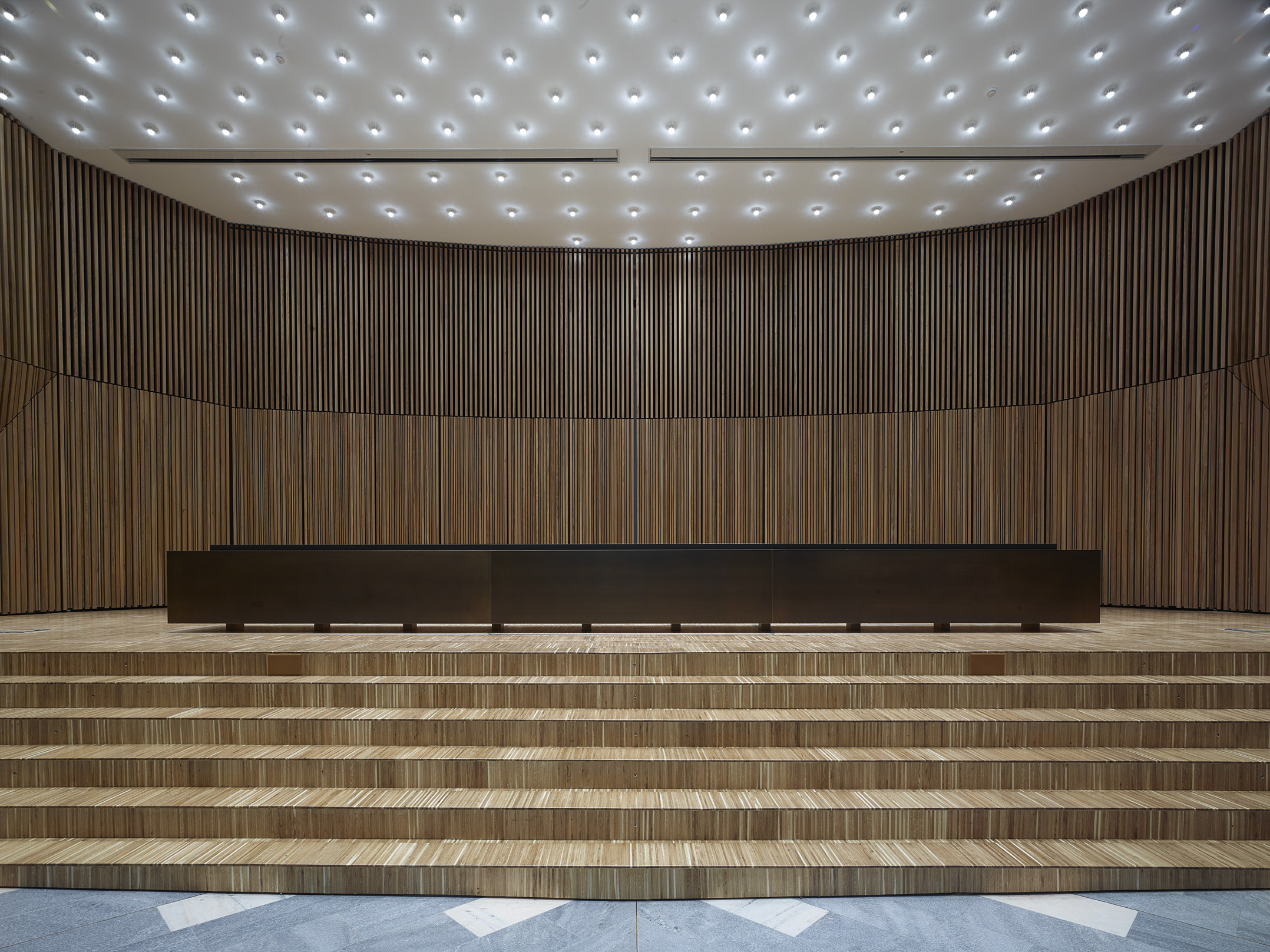 Tre le idee per risolvere il progetto: una bella parete, un bel soffitto, un bel palco. La parete di legno, con la sua geometria e il suo disegno, avvolge il visitatore e convince i tecnici degli impianti. Il soffitto, con le sue luci, illumina la sala e amplifica lo spazio esistente attraverso la sua morbidezza e leggerezza. Il palco, con i suoi oggetti monolitici, si presta ad essere utilizzato dall’oratore, come dall’artista, il ballerino, l’attore o chiunque esso sia.
