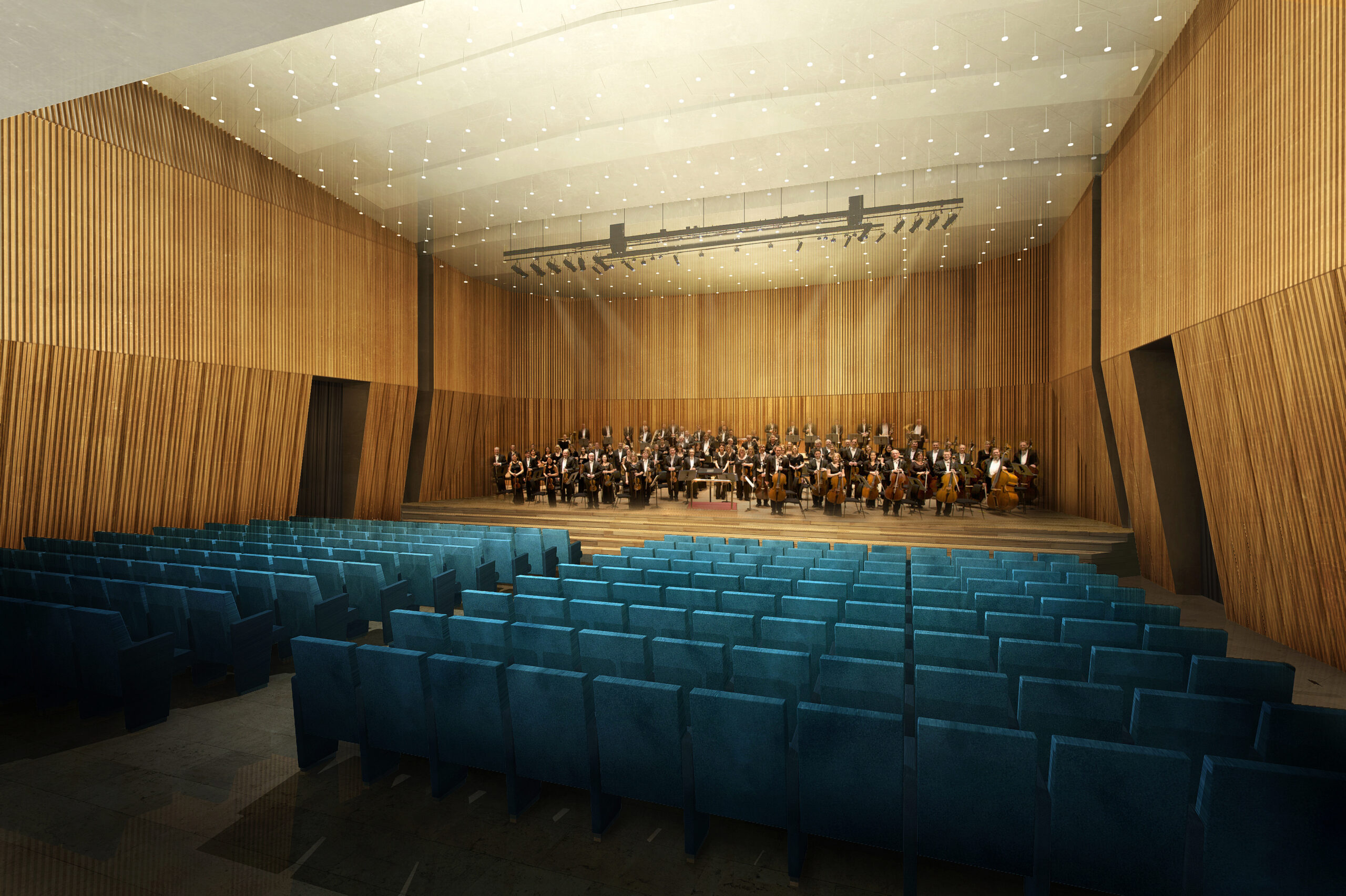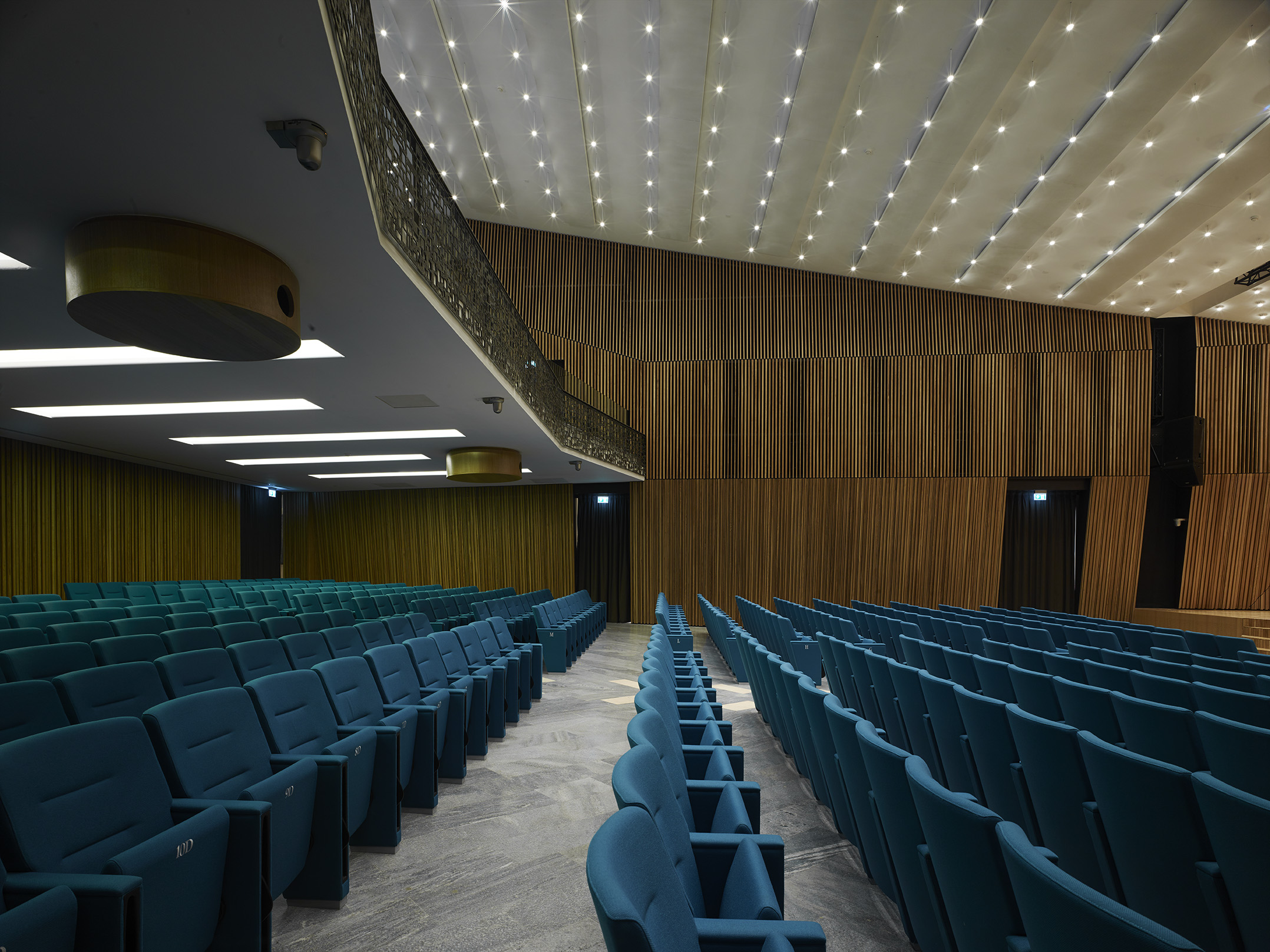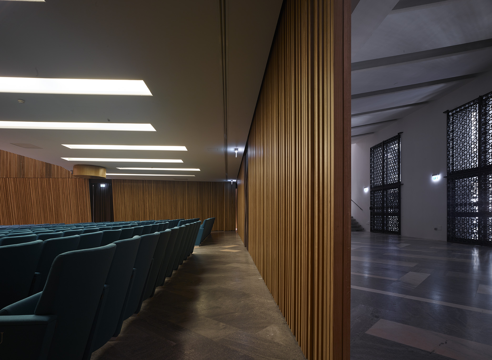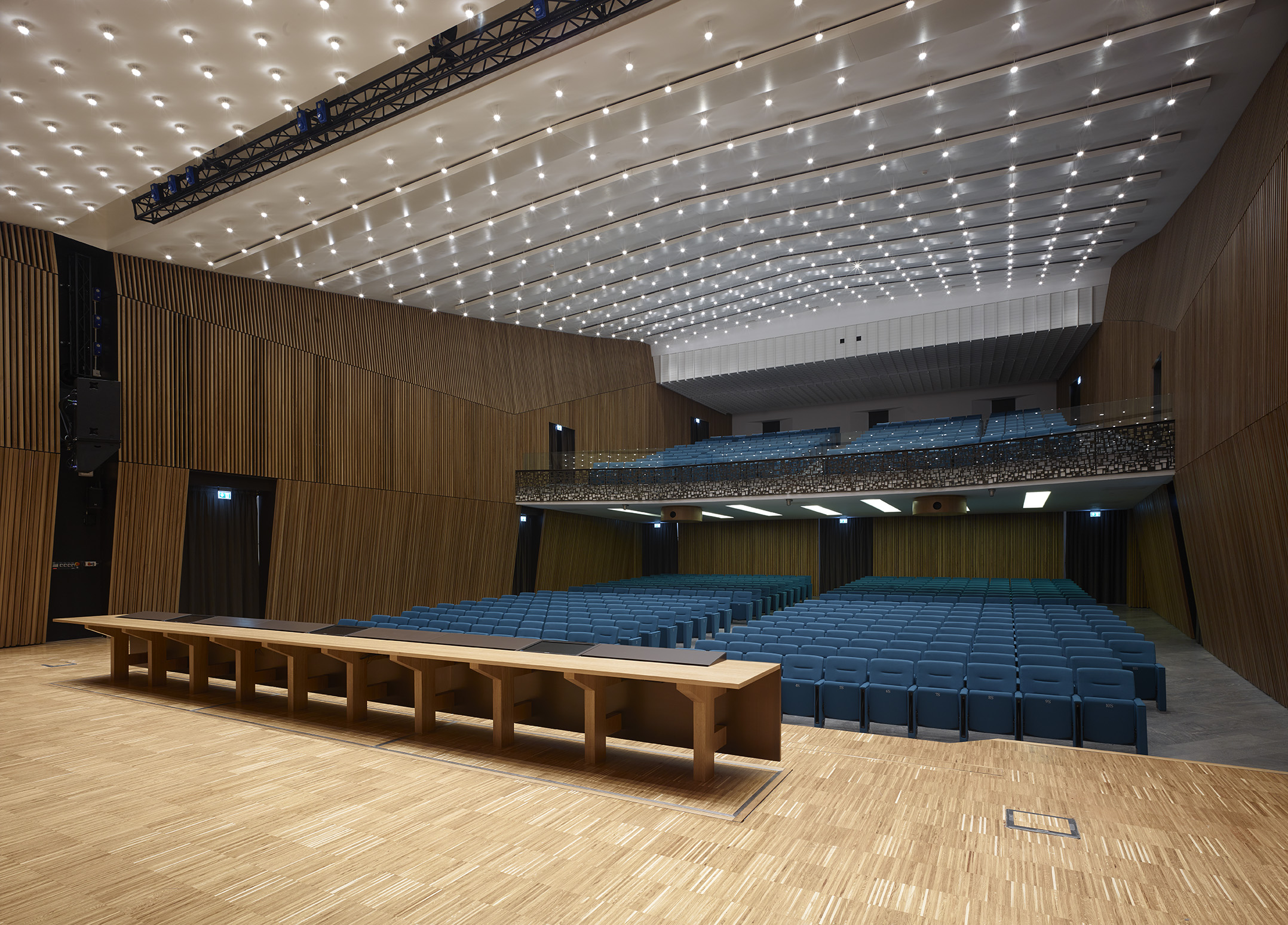 Tre le idee per risolvere il progetto: una bella parete, un bel soffitto, un bel palco. La parete di legno, con la sua geometria e il suo disegno, avvolge il visitatore e convince i tecnici degli impianti. Il soffitto, con le sue luci, illumina la sala e amplifica lo spazio esistente attraverso la sua morbidezza e leggerezza. Il palco, con i suoi oggetti monolitici, si presta ad essere utilizzato dall’oratore, come dall’artista, il ballerino, l’attore o chiunque esso sia.