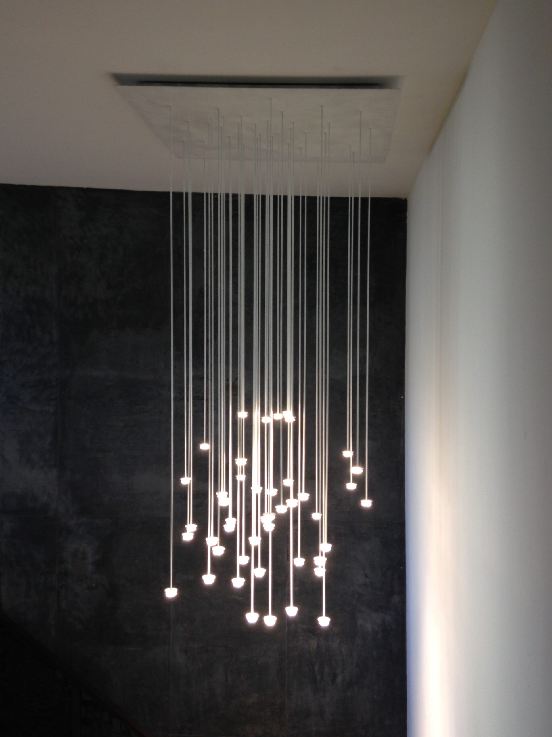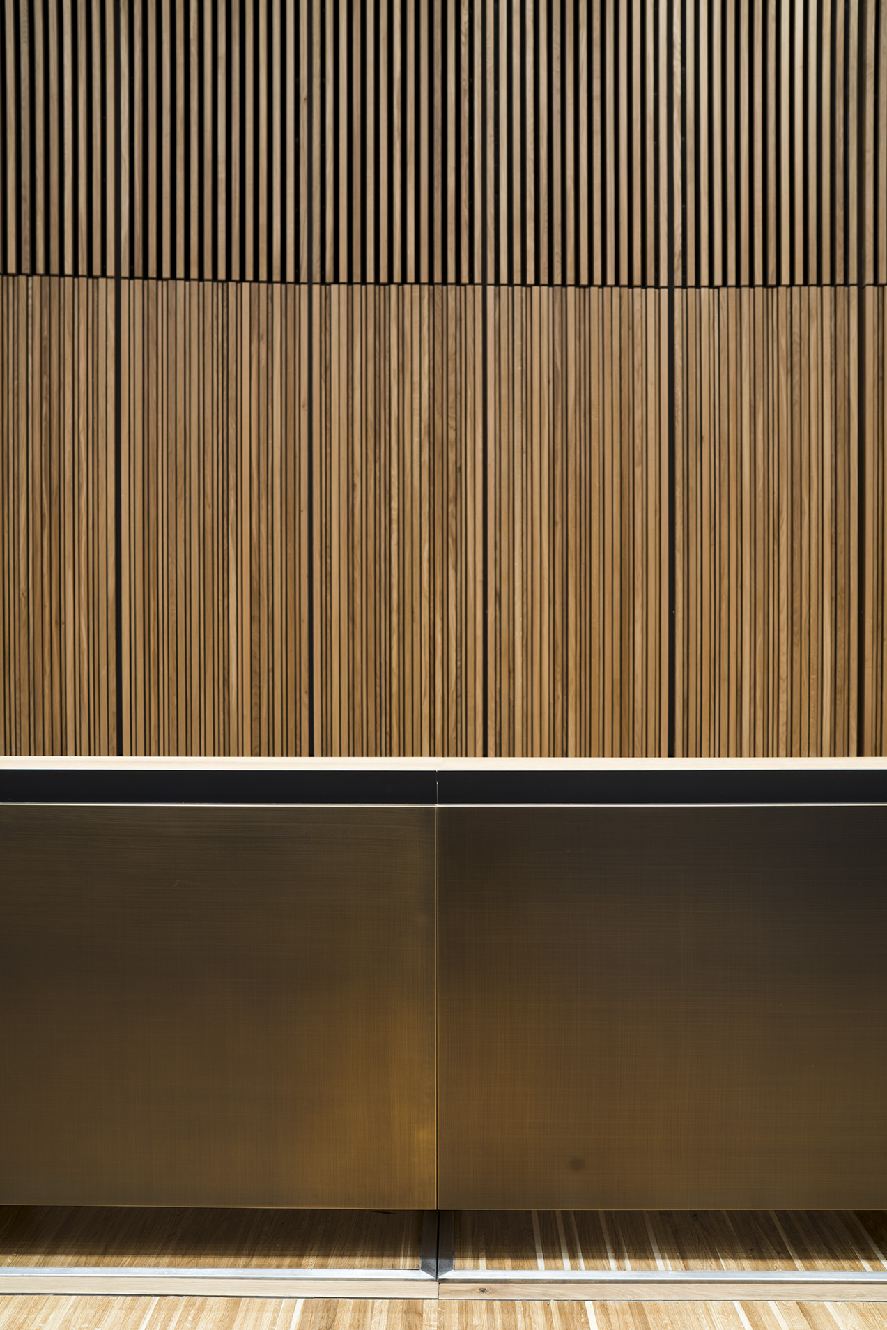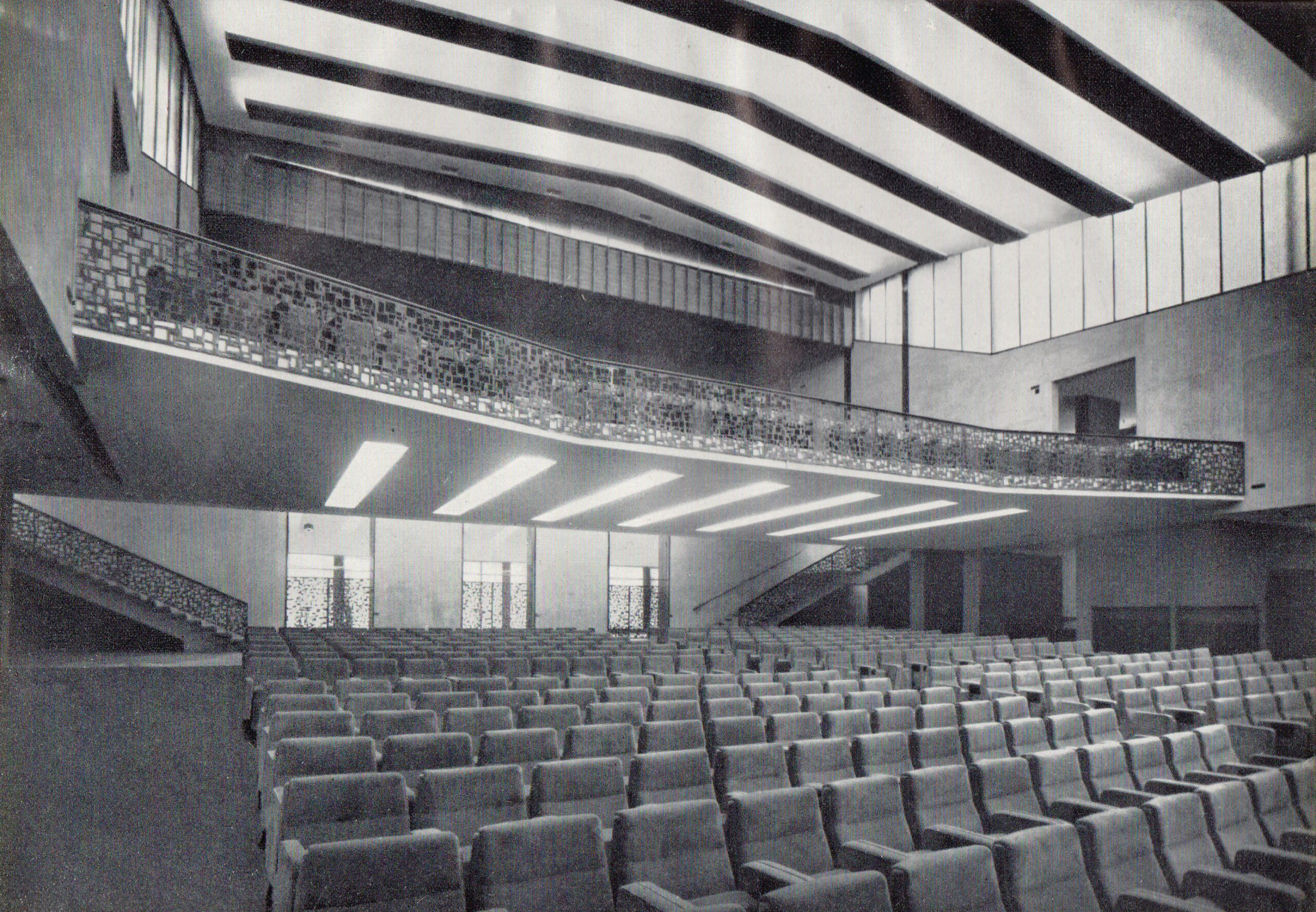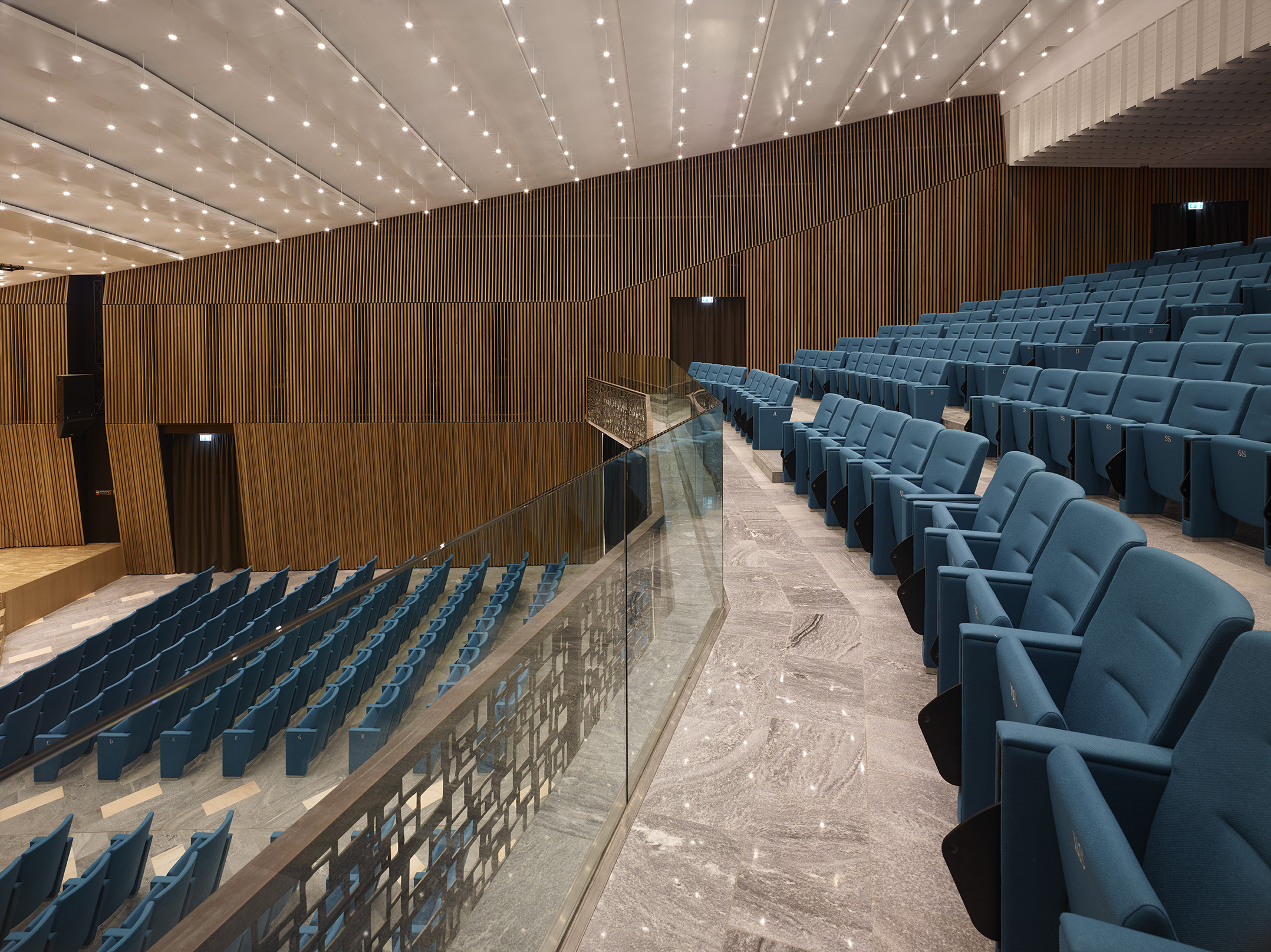 Tre le idee per risolvere il progetto: una bella parete, un bel soffitto, un bel palco. La parete di legno, con la sua geometria e il suo disegno, avvolge il visitatore e convince i tecnici degli impianti. Il soffitto, con le sue luci, illumina la sala e amplifica lo spazio esistente attraverso la sua morbidezza e leggerezza. Il palco, con i suoi oggetti monolitici, si presta ad essere utilizzato dall’oratore, come dall’artista, il ballerino, l’attore o chiunque esso sia.