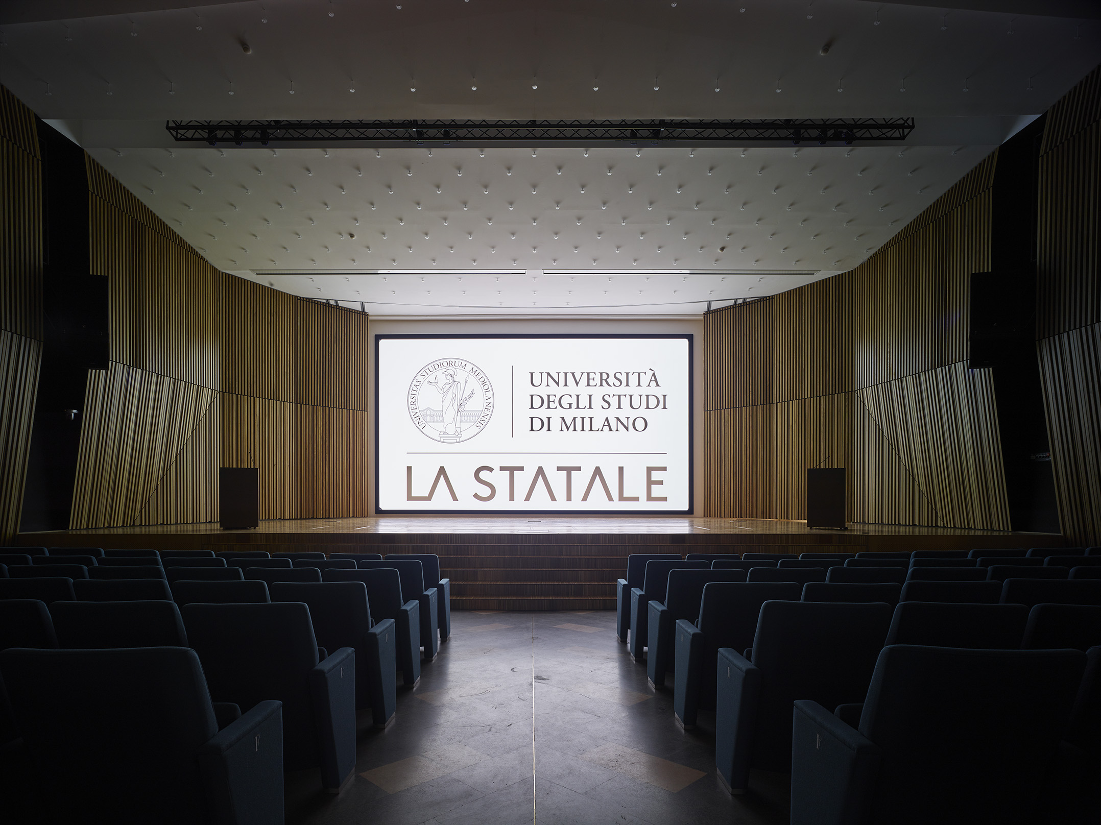 Il progetto di ristrutturazione dell’aula magna dell’Università degli Studi di Milano è l’occasione per ridare organicità ad un luogo che nel tempo e per effetto di successivi adeguamenti normativi ed impiantistici aveva smarrito la chiarezza dell’impianto originario. L’equilibrio formale che l’architetto Grassi aveva conferito alla sala dell’auditorium, viene ricostituito attraverso il recupero dei profili orizzontali delle pareti originarie, reinterpretando i materiali, le trasparenze e le linee che davano forma al grande spazio centrale.